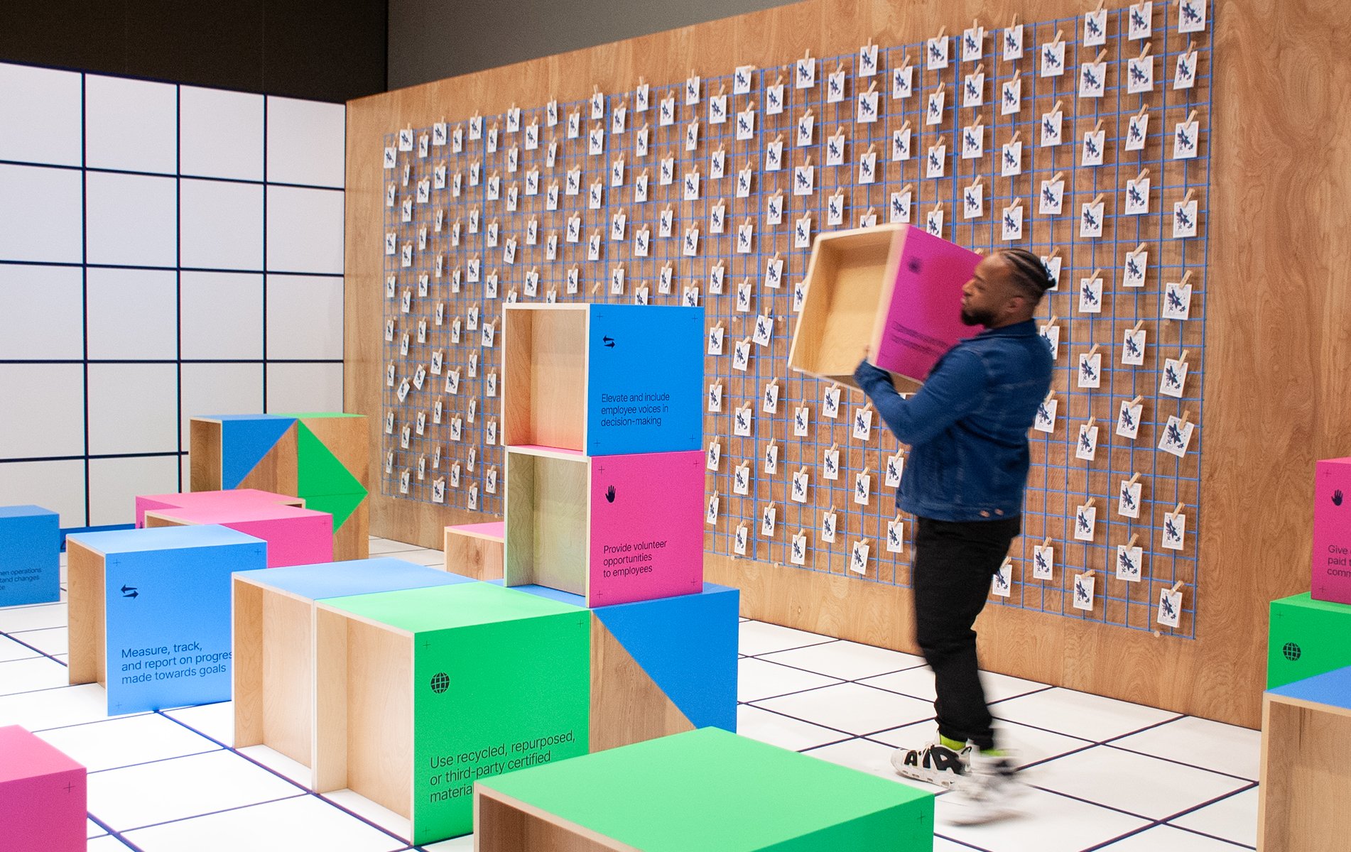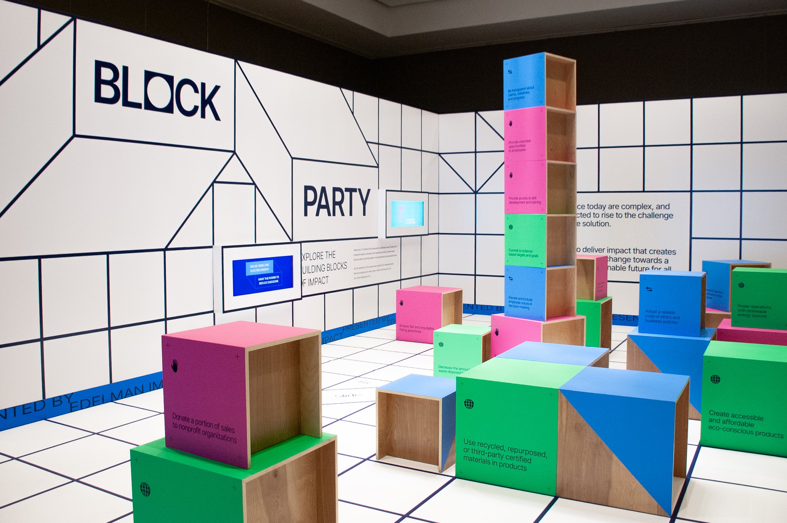 During this year’s SXSW event, our team introduced Edelman Impact, focusing on the core message of “action builds impact” with The Block Party. This interactive lounge experience aimed to promote trust-led behavior within the space. The Journey through The Block Party began with a captivating message wall, followed by stackable boxes with actionable steps companies can take to build a better future, and ended with a printable take-home.